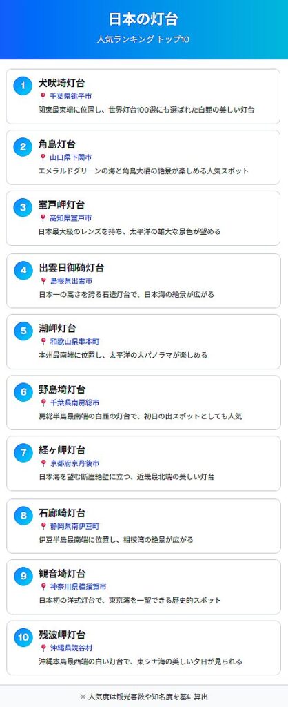 地元の観光情報やランキングを参考にすれば、灯台巡りをより充実させる計画が立てやすくなります。