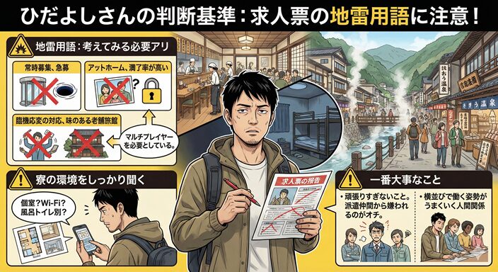 求人票の見方: 求人票から派遣先の状況を読み取る必要がある。求人票を見て、ひとり部屋か、食事は無料か、寮費は無料か、光熱費無料、Wi-Fiあるか、できれば露天風呂の入れるところ。良い条件が出るまで焦らず粘る。寮費、食事代を請求する会社は応募しない。